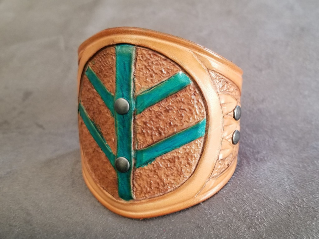 Bracelet en cuir tannage végétale fait main français, pour poignet, teint à la main et repoussage cuir (9)