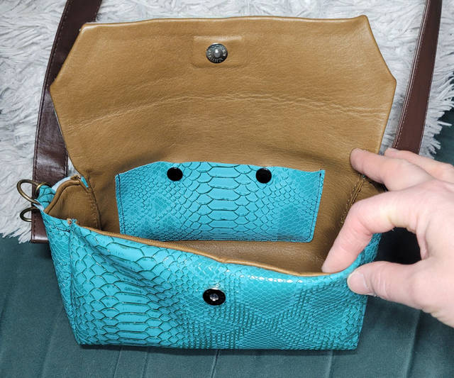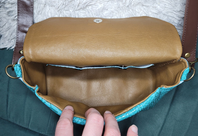 Intérieur cuir couleur camel, dessus simili cuir de couleur vert écaille de dragon.