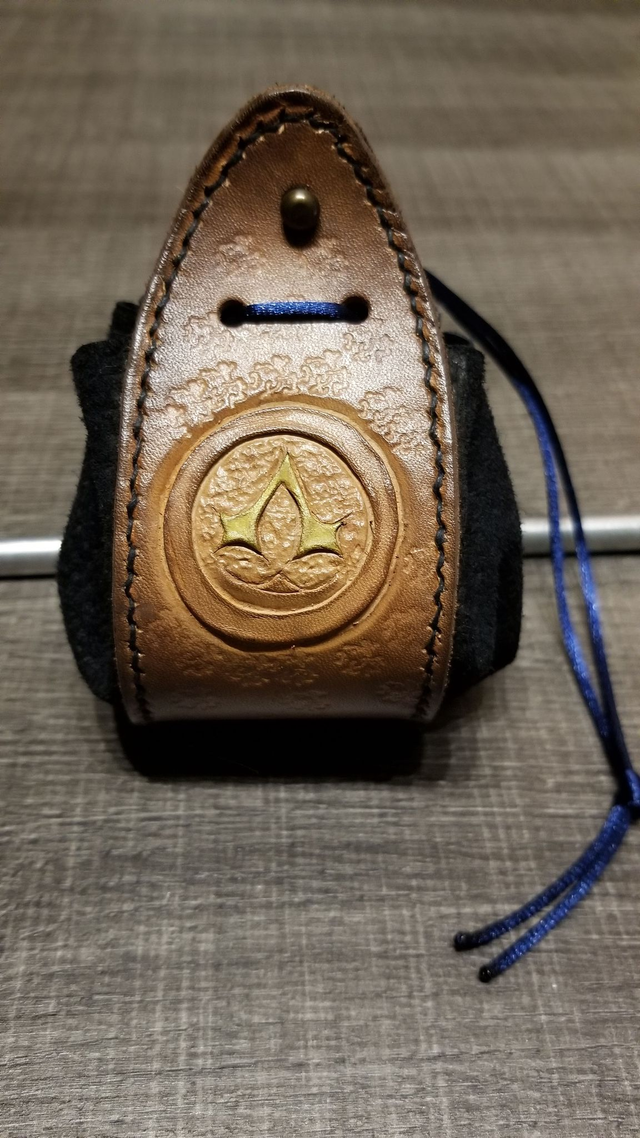 Fabrication à partir de cuir tannage végétal couleur naturelle teint à la main; utilisation de la technique de repoussage pour réaliser les motifs, et couture sellier à la française.